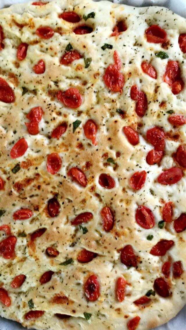 **OPTIONAL- slive mini tomatoes in half and open them over focaccia so that all juices gather in creases with oil. Cut up olives and add with oregano