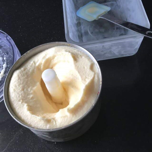 Pour in mixture into gelato machine leaving any deposits into the bowl